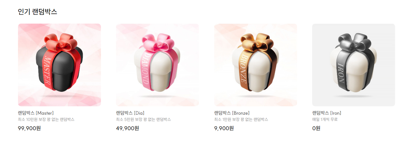 이렇게 형성되어 있다는점 참고하시길 바랍니다~~! 아래링크에 접속하시면 랜덤박스에 대한 더 자세한 정보를 확인하실 수 있습니다.