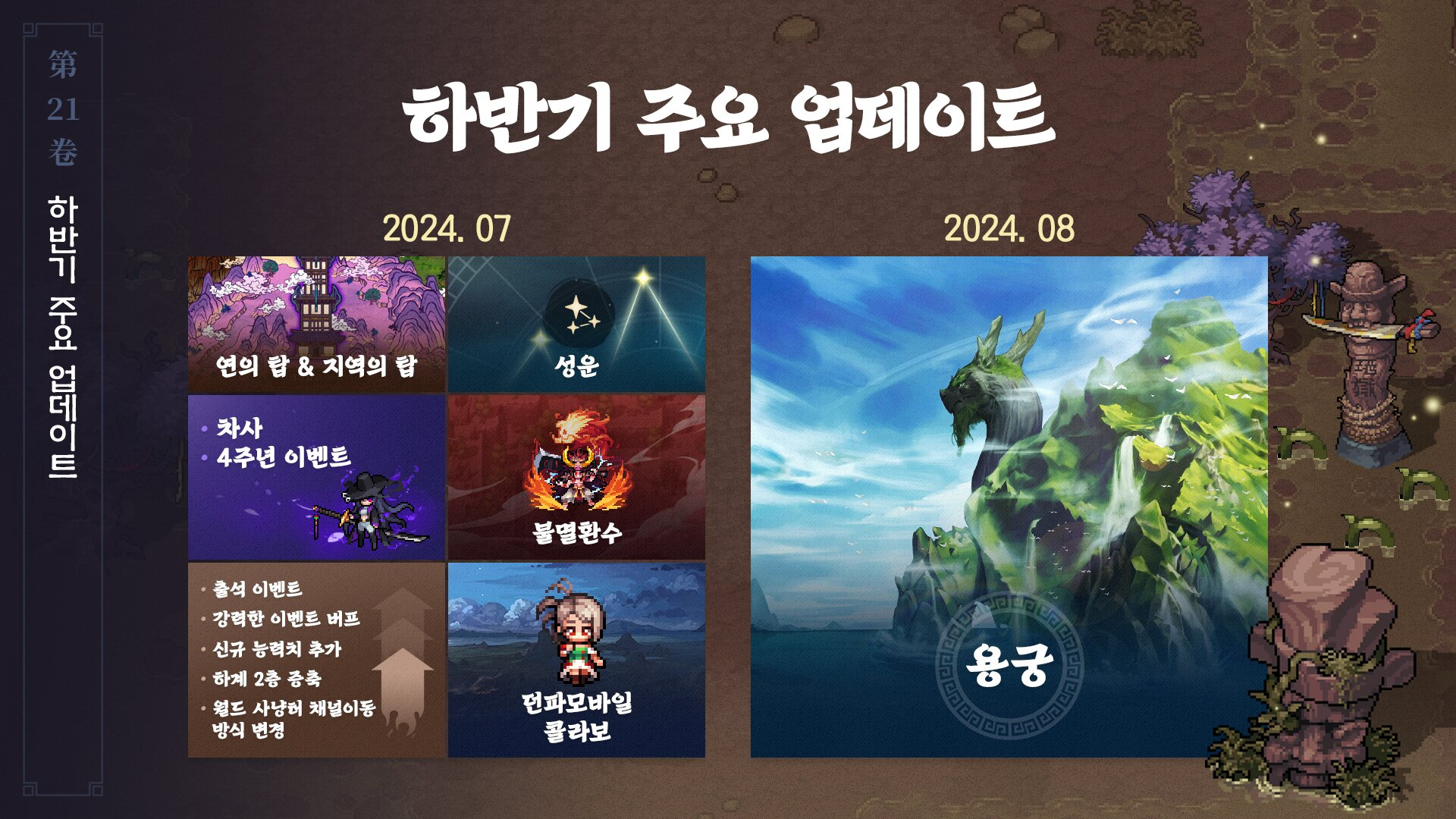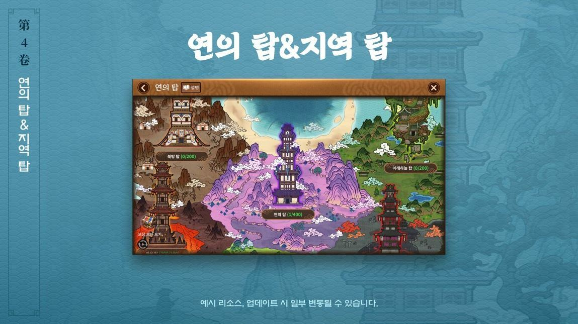 7월과 8월 예정되어 있는 주요 업데이트 내용은 신규 성장 콘텐츠 '연의 탑' & '지역 탑'입니다. '연의 탑'은 1인 플레이가 가능한 신규 성장 콘텐츠이고, 층이 높아질수록 난이도가 상승합니다. 특정 층 수 이상 올라가면 '보물', '전설' 등급 장비나 '무공 비급', '끈옷' 외형 등 보상을 제공한다고 합니다. '지역의 탑'은 지옥, 북방, 아래하늘, 일본 지역 내 하나씩 생성되는 탑입니다. '역 탑'은 돌파 가능한 층에 따라 지역 내 적정 난이도의 사냥터를 파악할 수 있으며, 층별로 성장에 필요한 재료를 획득할 수 있는 것이 특징입니다.