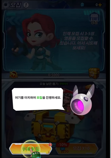 이게임에는 영웅 뽑기도 중요한 요소입니다. 영웅은 모집을 통해 뽑을 수 있고 영웅 등급은 SSS, SS, S, 보라, 파랑, 초록으로 등급표가 구성되어 있습니다.