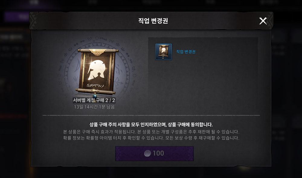 직업 변경권이 상점에 추가되었습니다. 이번에 판매되는 직업 변경권은 상시 판매 상품이 아닌 기간 한정 판매 상품으로써 계정 당 2회까지 구입할 수 있습니다. 상점에서 은화 100으로 구입할 수 있으며, 구입 조건은 [2막 15장], [16. 하제산으로 이동] 퀘스트를 완료해야 합니다. 사용 시 주의사항으로는 현재의 직업이나 부직업으로 변경이 불가능하고, 장착 중인 장비 프리셋 1 / 2 / 3에 모든 무기와 방어구가 장착 해제된 상태여야 쓸 수 있습니다.