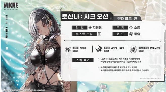 이번 여름 수영복 로산나: 시크 오션입니다. 로산나: 시크 오션은 지원형 버스트 2, 소총으로 나옵니다. 공개된 특징은 적의 파츠를 파괴할 때마다 아군 공격 능력을 상승시키는 효과를 지녔습니다. 더불어 아군에게 빠르게 파츠를 파괴할 수 있는 지원과 파츠를 파괴했을 때 강력한 공격 능력을 유지시킬 수 있습니다.