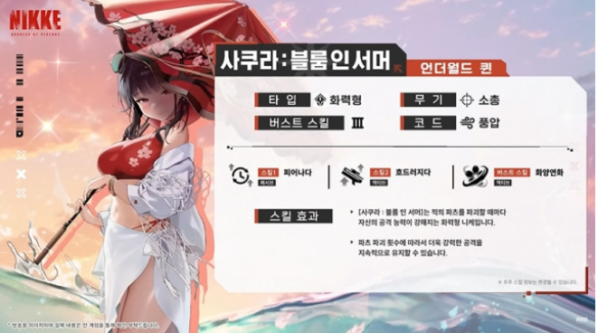 사쿠라: 블룸 인 서머는 화력형 버스트 3, 소총 니케입니다. 능력은 적의 파츠를 파괴할 때마다 자신의 공격 능력이 강해집니다. 추가로 파츠 파괴 횟수에 따라 더 강력한 공격을 유지할 수 있습니다. 로산나: 시크 오션과 함께 사용하기 좋은 스킬 구성이라 파츠가 많은 보스를 상대할 때 유용합니다.