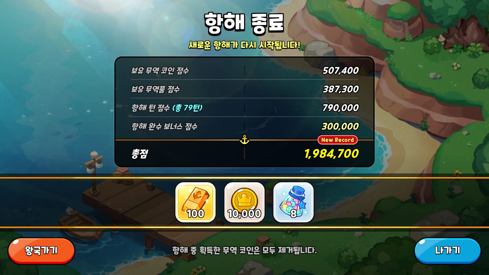 - 항해 방식: 항해는 턴 방식으로 진행되며, 이동할 때마다 무역선의 내구도가 소모됩니다. 내구도는 매 항해 시작 시 100%로 충전되며, 선장 쿠키 효과에 따라 기본 내구도가 증가할 수 있습니다. 내구도가 0이 되거나 모든 항해 일지를 완수하면 항해가 종료됩니다.