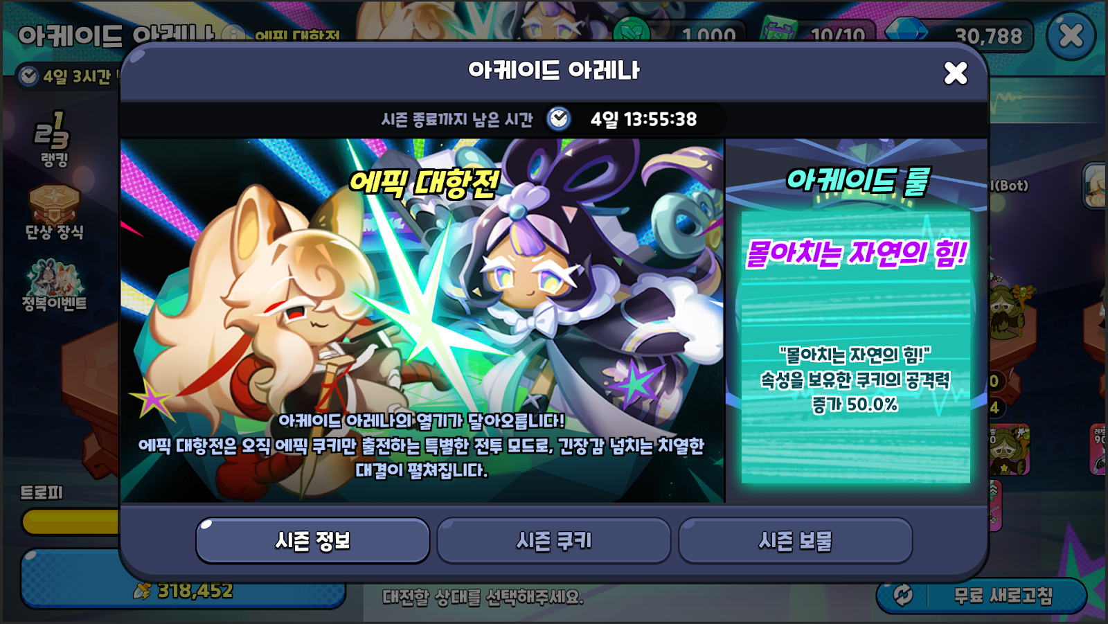 - 아케이드 아레나: 매 시즌 새로운 전투 모드와 규칙이 적용되는 전략 PvP 콘텐츠입니다. 1시즌은 5:5 에픽 쿠키 전용, 2시즌은 5:5 에픽 쿠키와 보물 5종 전략 모드로 진행됩니다. 입장권 소모, 최소 레벨 적용, 티어 시스템, 시즌 및 티어 달성 보상이 있습니다.