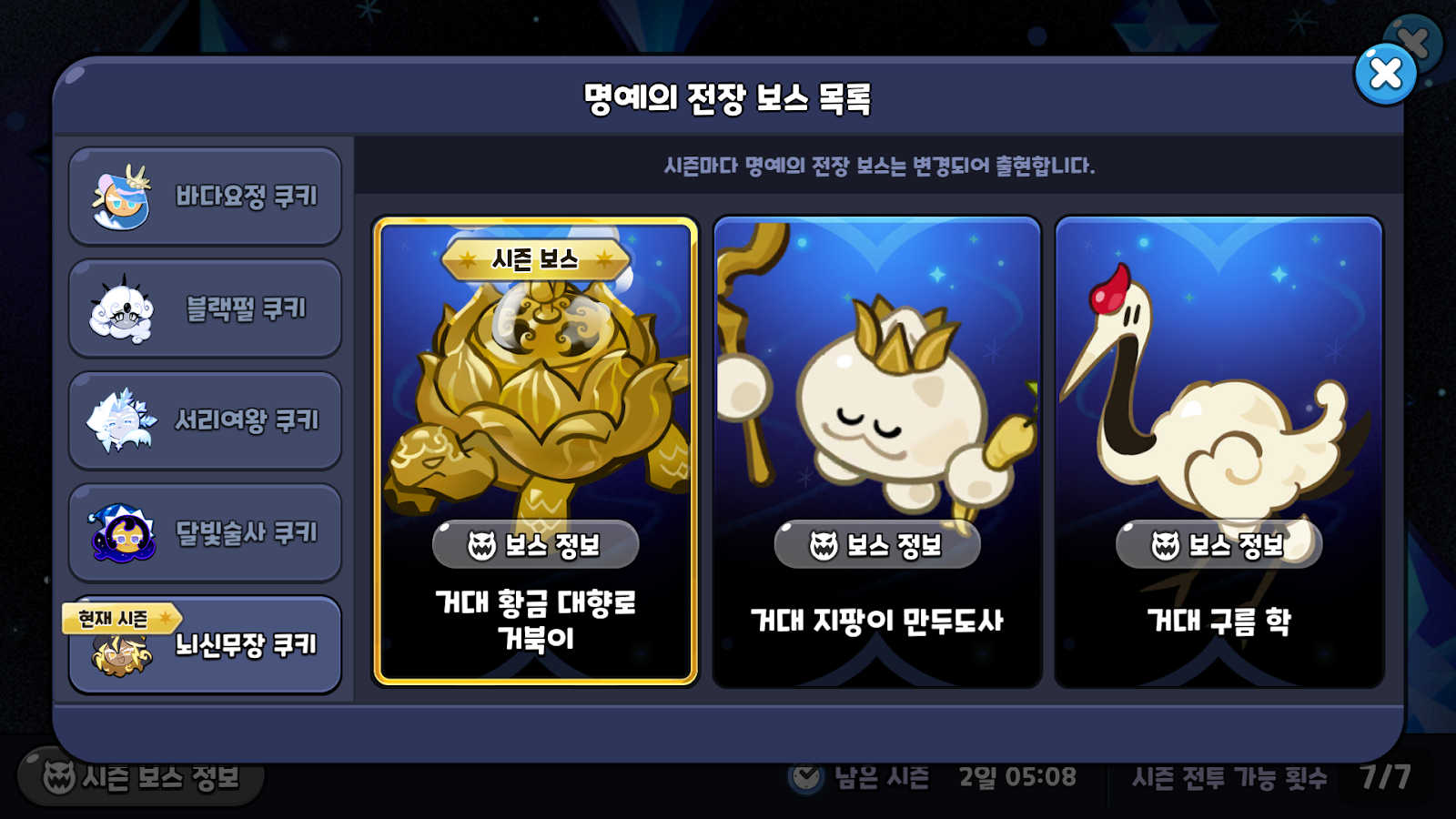 - 명예의 전장: 증명의 전장 10층 클리어 후 도전할 수 있는 보스 스테이지입니다. 1주일 단위 시즌제로 운영되며, 각 쿠키별 전장이 순차적으로 열립니다. 시즌마다 3종 보스 중 1종이 랜덤으로 등장하며, 보스 특성을 고려한 파티 구성이 중요합니다. 최초 클리어, 시즌, 플레이 보상을 획득할 수 있습니다.