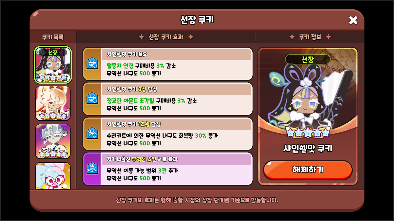 - 선장 쿠키: 보유한 쿠키들 중 원하는 쿠키를 선장으로 임명할 수 있습니다. 현재 샤인쉘맛 쿠키, 만쥬맛 쿠키, 오이스터맛 쿠키, 멜로우버니 쿠키, 캡틴캐비어맛 쿠키, 검볼다이버맛 쿠키가 선장으로 활약할 준비를 마쳤습니다. 각 선장 쿠키는 성장도에 따라 항해 중 발동하는 고유한 특별 효과를 제공하니, 신중하게 선택하세요. 선장 효과는 새로운 항해를 시작할 때의 성장도를 기준으로 적용됩니다.