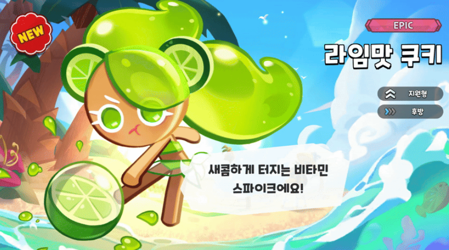 - 라임맛 쿠키 (지원형): '비치볼 속 깜짝 선물'로 아군에게 체력 보호막과 회복을 부여하며, 시트러스 쿠키들과 함께 전투 시 추가 버프를 얻고 모든 버프가 강화됩니다.
