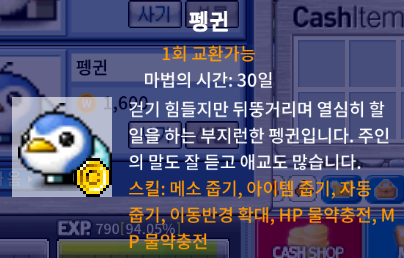 MMORPG에서 늘 인기가 많지만, 메이플랜드에서는 특히 그 인기가 압도적인 펭귄입니다. 리프레 지역에서는 10명 중 3명 이상이 펭귄을 데리고 다닐 정도입니다.