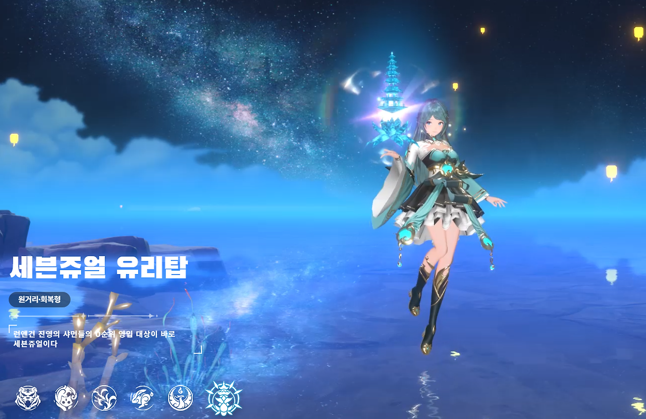 - 세븐쥬얼 유리탑: 보석과 유리탑을 모티브로 한 독특한 방어 및 지원형 스피릿입니다. 전투에서의 안정성과 지속력을 극대화하는 데 특화되어 있으며, 강력한 보호막 생성, 방어력 상승, 아군 버프, 그리고 적의 공격을 효과적으로 차단하는 다양한 전략적 기능을 수행합니다.