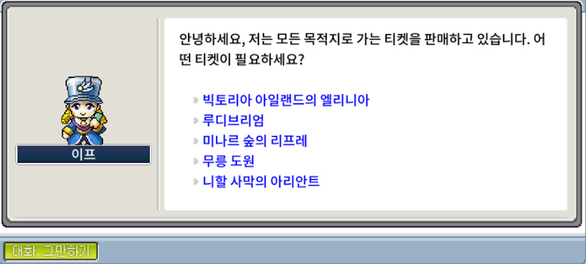 - 중앙에 있는 NPC 이프에게 말을 걸어 '니할 사막의 아리안트'로 가는 티켓을 구매합니다. 가격은 6000메소입니다.