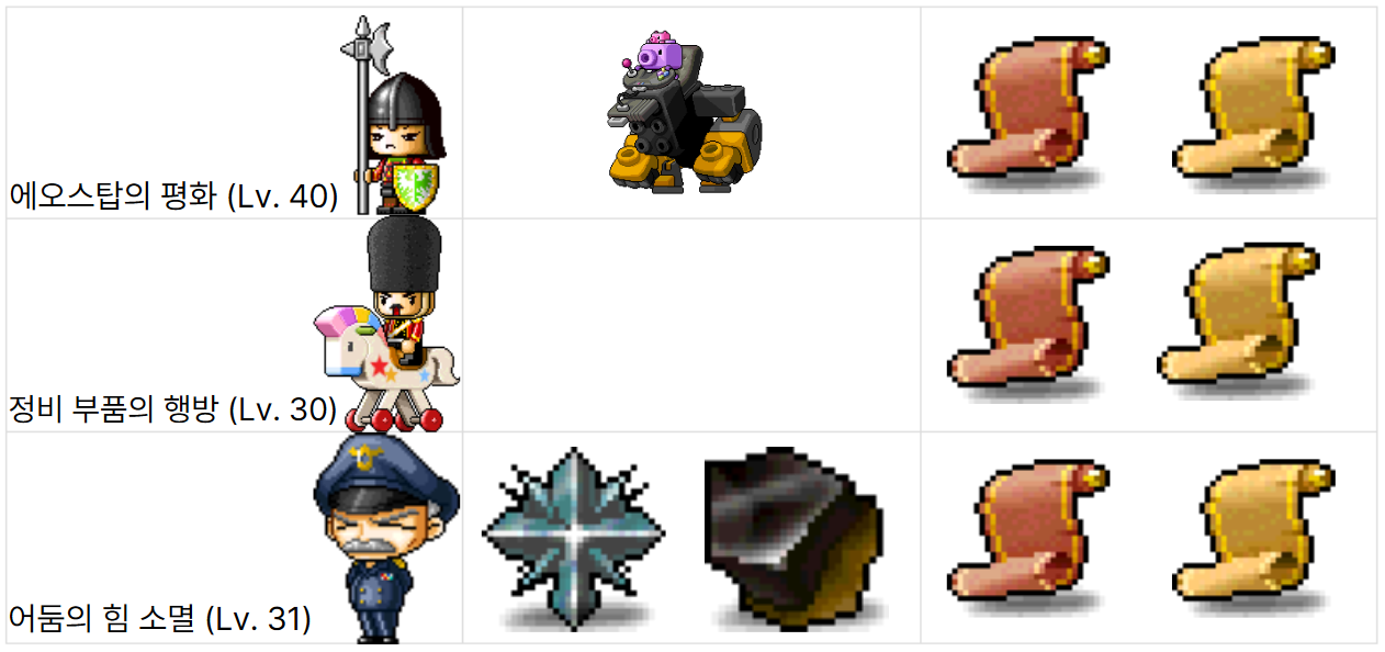 - 정비 부품의 행방 (Lv. 30): 루디브리엄의 점프맵을 통과해 숨겨진 상자를 개봉하는 퀘스트입니다. 난이도가 있지만, *신발 이동속도/점프력 주문서 10% 또는 60%*를 보상으로 얻을 수 있습니다.