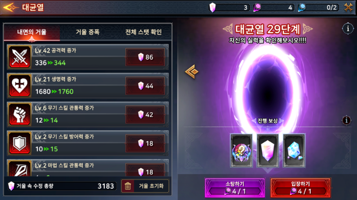 - 레벨 달성 보상: 30, 50, 100, 200, 300, 500레벨을 달성할 때마다 보석, 영혼, 장비 소환권 등 더욱 큰 보상을 받을 수 있습니다.