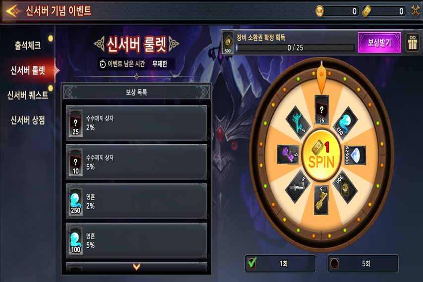 - 룰렛 이벤트: 신서버 이벤트 퀘스트를 완료하면 '룰렛 티켓'을 얻고, 이를 사용해 랜덤 아이템과 누적 횟수에 따른 추가 보상을 노려볼 수 있습니다.