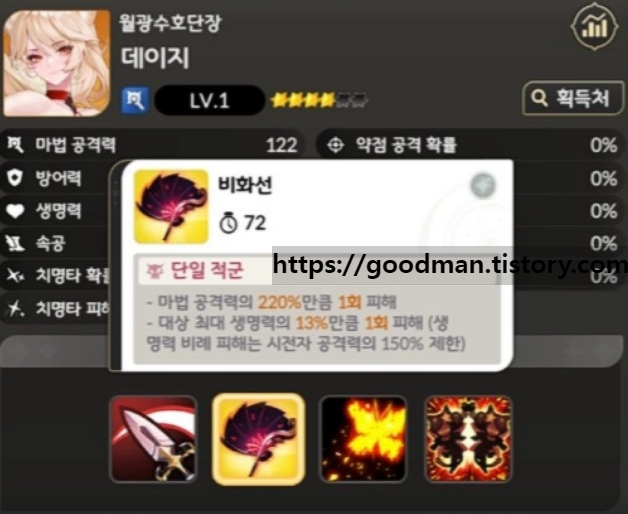 액티브 스킬 '비화선': 단일 적에게 마법 공격력과 대상 최대 생명력에 비례한 피해를 줍니다. 6초월 시 공격력 상한선이 크게 증가하여 서브 딜링 능력이 강화됩니다.