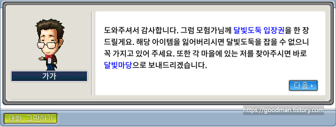 - 입장권 획득: NPC 가가를 클릭하여 '달빛 도둑 입장권' 1매를 받습니다. (이 입장권은 받은 날로부터 24시간 이내에 사용해야 하는 것으로 보입니다.)