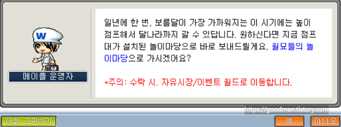 이번 '달빛 도둑을 잡아라' 파티 퀘스트는 메이플 월드의 추석 이벤트 기간 동안 하루에 한 번씩 진행이 가능한 일일 퀘스트입니다. 캐릭터 레벨에 따라 보상으로 주어지는 경험치 양이 상당하고, 유용한 버프 아이템까지 얻을 수 있어 고레벨은 물론 육성 중인 캐릭터에게도 필수적인 코스라고 할 수 있습니다.