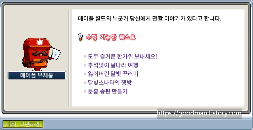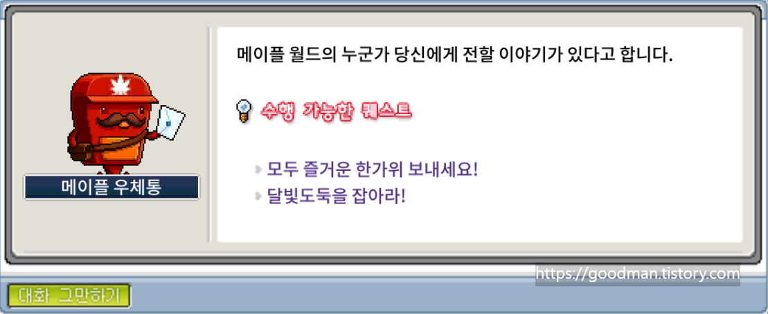 퀘스트를 시작하려면 먼저 각 마을에 있는 NPC '가가'를 찾아가야 합니다. 보통은 메이플 우체통 알림을 통해 퀘스트를 수락하고 가가를 클릭하여 입장권을 받을 수 있습니다.