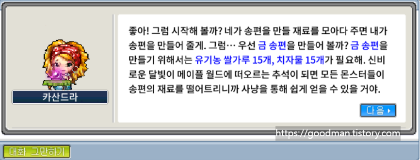이 선행 퀘스트는 단 한 번만 수행하면 되고, 이후로는 매일 다른 송편 만들기 퀘스트를 진행할 수 있습니다.