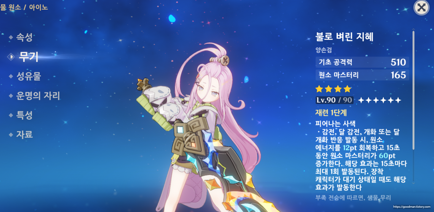 추천 성유물 및 무기 세팅: 원충과 원마 위주
