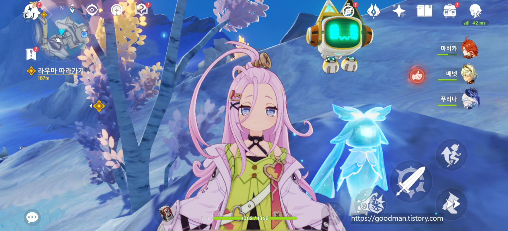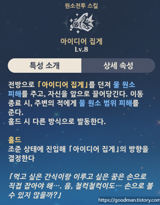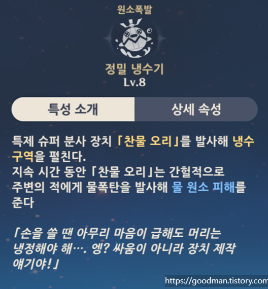 원소 폭발 (Q) 메커니즘: 주기적으로 물폭탄을 발사하는 '오리 로봇'을 소환합니다. 지속 시간이 14초, 쿨타임이 13.5초로 거의 무한 유지가 가능하여, 사이클이 빠른 파티에서 물 부착 담당으로 특히 유용합니다.