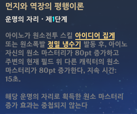 C1 (추천 돌파): E 또는 Q 사용 시 15초 동안 아이노 및 필드 위 캐릭터의 원소 마스터리가 80 증가합니다. 원마 버프를 제공하여 가성비가 가장 높은 돌파입니다.