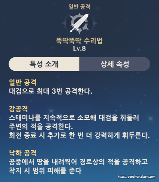 - 가장 합리적인 투자: 육성 재화를 아끼기 위해 특성 레벨을 1/1/1로 유지하는 것이 권장됩니다. 투자를 한다면 원소 폭발(Q) 레벨만 올려줍니다.