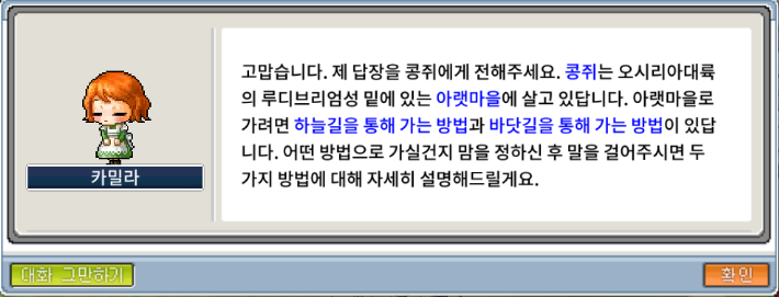 - 엘리니아 정거장에서 퀘스트로 받은 티켓을 사용해 오르비스행 배를 탑승합니다. (배는 15분 간격으로 출발하며, 탑승 시간은 약 10분입니다. 출발 5분 전에 미리 탑승해야 안전합니다.)