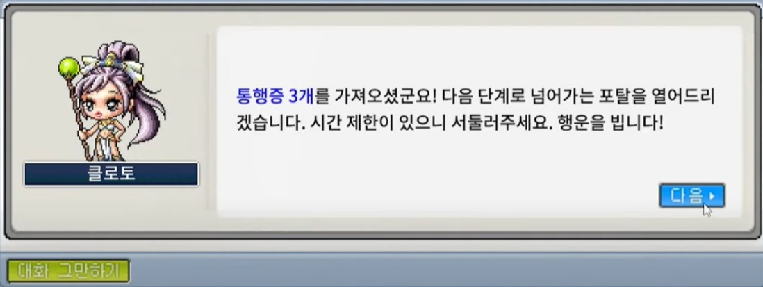 획득한 쿠폰은 통행증으로 교환할 수 있으며, 파티장은 통행증 3장을 모아 클로토에게 제출하면 다음 단계로 이동합니다.