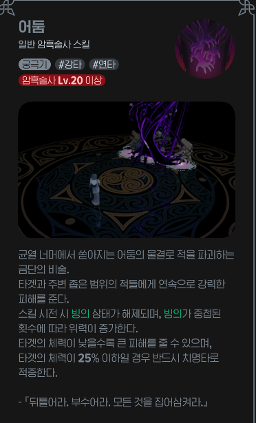 | 2번 | 어둠의 손아귀 | 몹몰이, 브레이크. 대미지는 낮지만 잠식 수치 증가. | 5스킬 사용 후 잠식 증가 효과가 사라질 때, 쿨타임 돌 때마다 사용하여 효율 유지. |