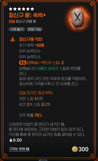 | 5번 | 제사장 | 의식 사용 시 공격력/스킬 사용/캐스팅 속도 증가. | 딜 사이클의 속도를 올려주는 유틸성 룬. |