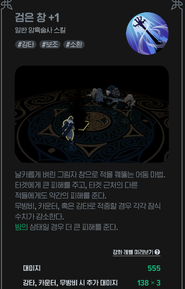 | 3번 | 검은 창 | 광역 강력 피해의 주력 딜링기. 낙인 중첩 시 쿨타임 감소. | 무방비, 카운터 등 특정 조건에서 추가 피해 가능. 가장 자주 쓰는 딜 스킬. |