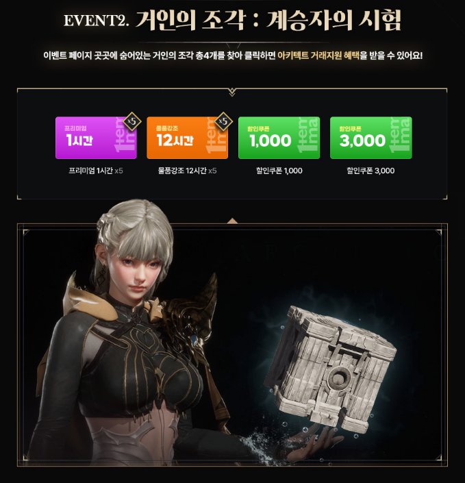 이벤트 페이지에 숨겨진 '거인의 조각'을 찾아내면 즉시 푸짐한 거래 지원 아이템이 지급됩니다.
