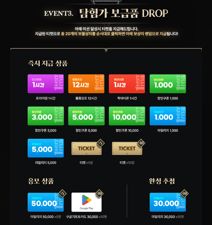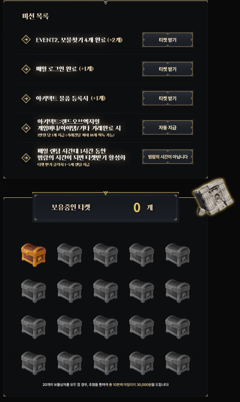 - 이벤트 페이지의 5가지 미션을 수행하여 티켓을 획득합니다.