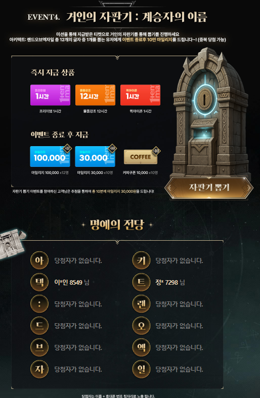이벤트 3에서 획득한 티켓을 사용하여 '거인의 자판기'를 돌리고, 통 큰 마일리지 혜택과 특별 커피 쿠폰의 행운을 잡으세요.