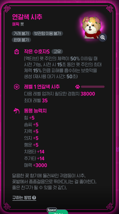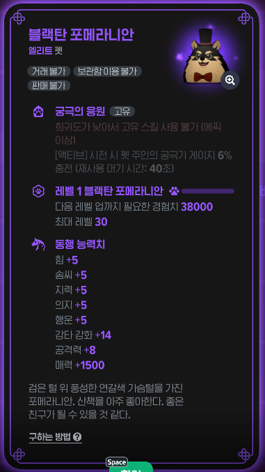 다만, 고유 스킬과 동행 능력치가 모두 준수한 펫들도 높은 티어를 형성하고 있는데요. 블랙탄 포메라니안, 흰 아기 올빼미, 그리고 연갈색 시추가 그 대표적인 예입니다. 특히 포메와 올빼미는 반사 신경 패시브를 통해 고유 스킬 가동률을 높여 각각 궁극기 및 속도 측면에서 특정 직업군의 종결 펫으로 인정받고 있습니다. 시추는 액티브 스킬로 안정성을 크게 높여주죠.