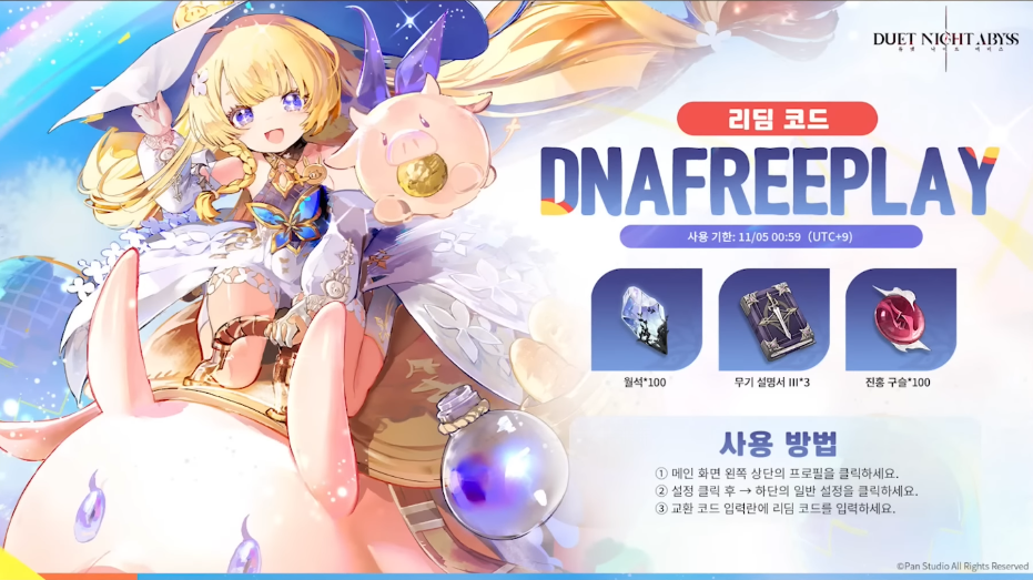 - DNAREEPLAY → 월석 100개, 전투선율 3개, 진홍굿 100개