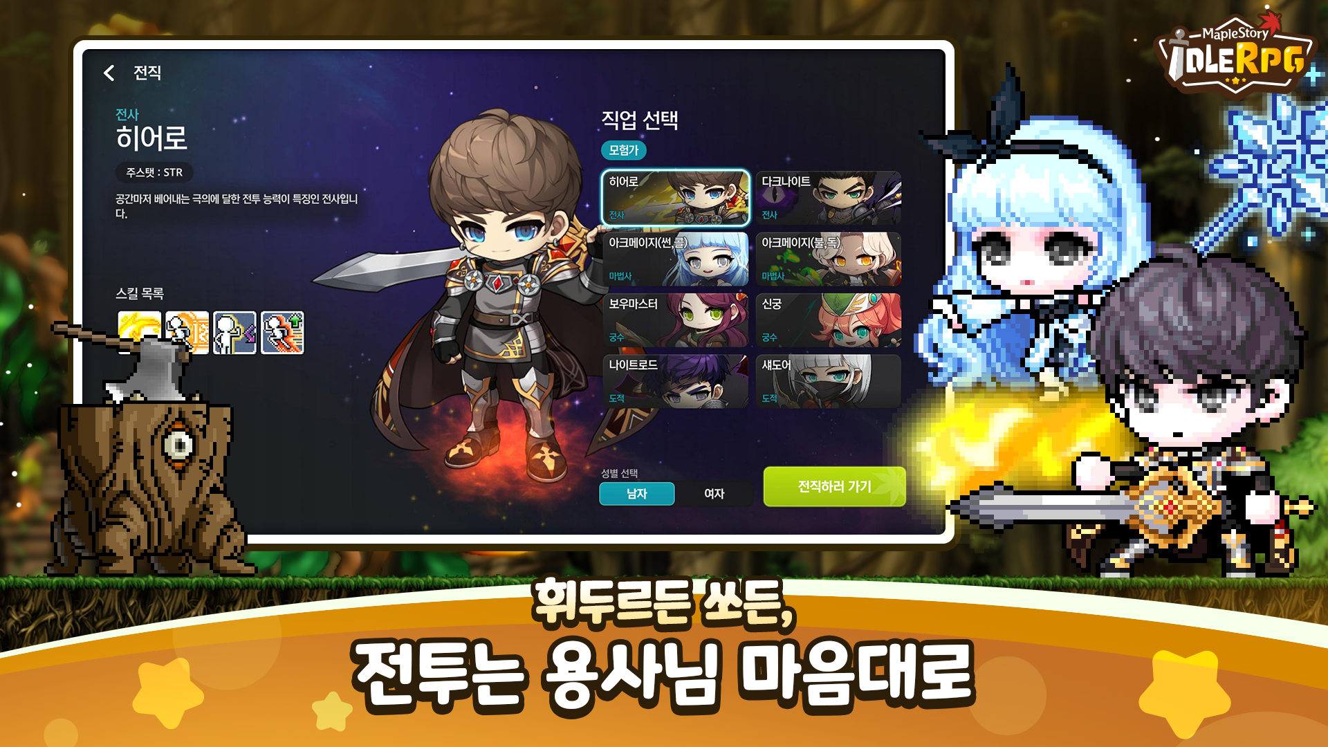 원작 직업 구현: 히어로, 다크나이트, 아크메이지, 보우마스터, 신궁 등 원작의 대표적인 직업들이 구현되어 있어 유저의 취향에 맞게 선택하여 전직 플레이를 할 수 있습니다. 글로벌 CBT 자료를 참고하면 총 8종의 직업이 출시될 것으로 보입니다.