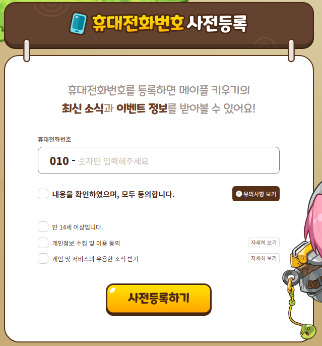 게임 출시를 손꼽아 기다리고 있다면, 가장 먼저 해야 할 일은 단연 메이플 키우기 사전등록입니다. 보상 구성이 굉장히 알찬데요. 전화번호 인증 또는 마켓 등록만으로 풍성한 혜택을 받을 수 있습니다.