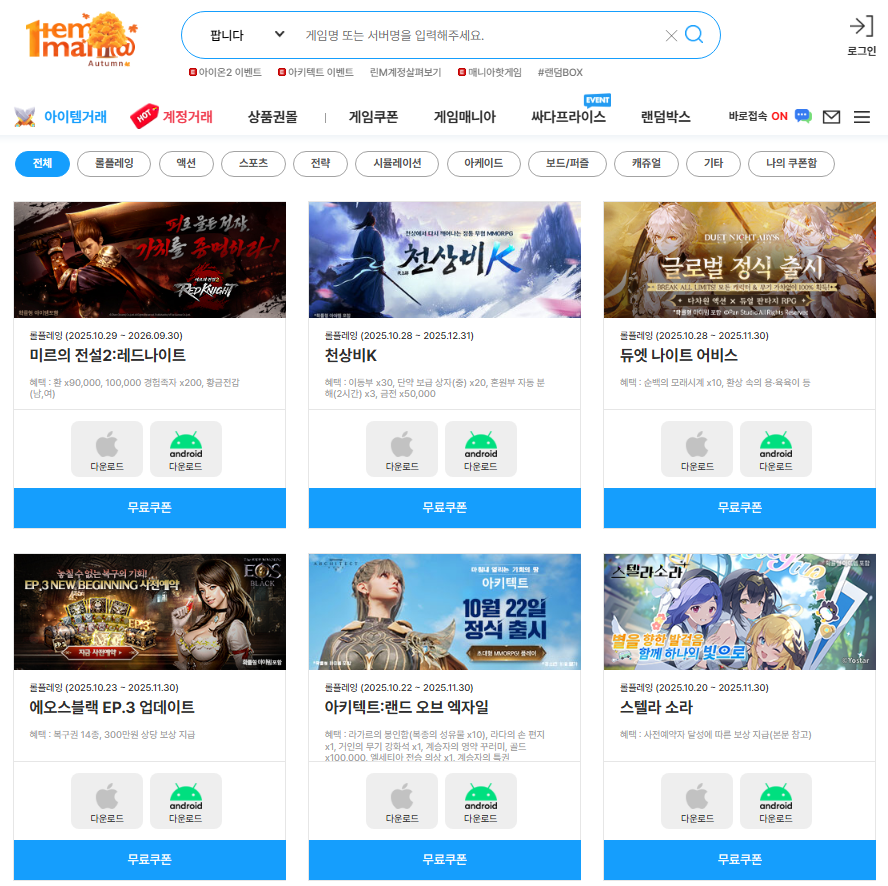 아이템매니아 독점! 인기 게임 쿠폰 정리