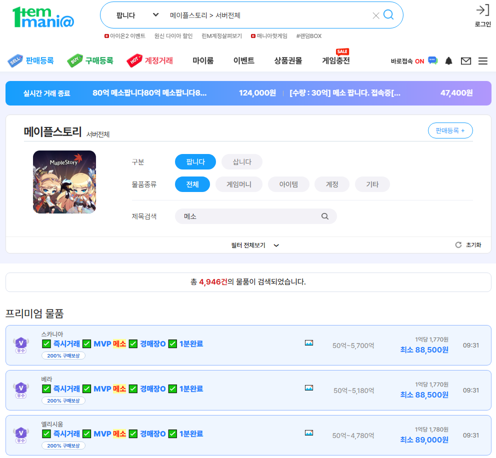 직접 아이템매니아에 들어가서 메이플스토리 카테고리를 한 번 둘러보세요.