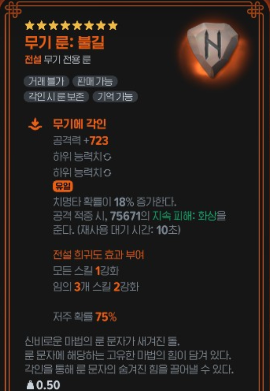 ‘들불’ 룬은 화상 피해 적 공격 시 치명타 확률이 상승하여 불길 무기와 시너지가 좋습니다.