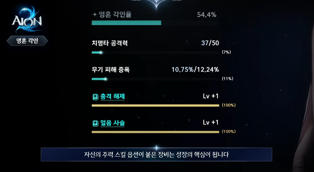 특징: 장비를 장착할 때 랜덤하게 영혼 각인 옵션이 부여됩니다. 이 옵션이 특정 마스터리 스킬의 레벨을 올려주는 역할을 합니다.