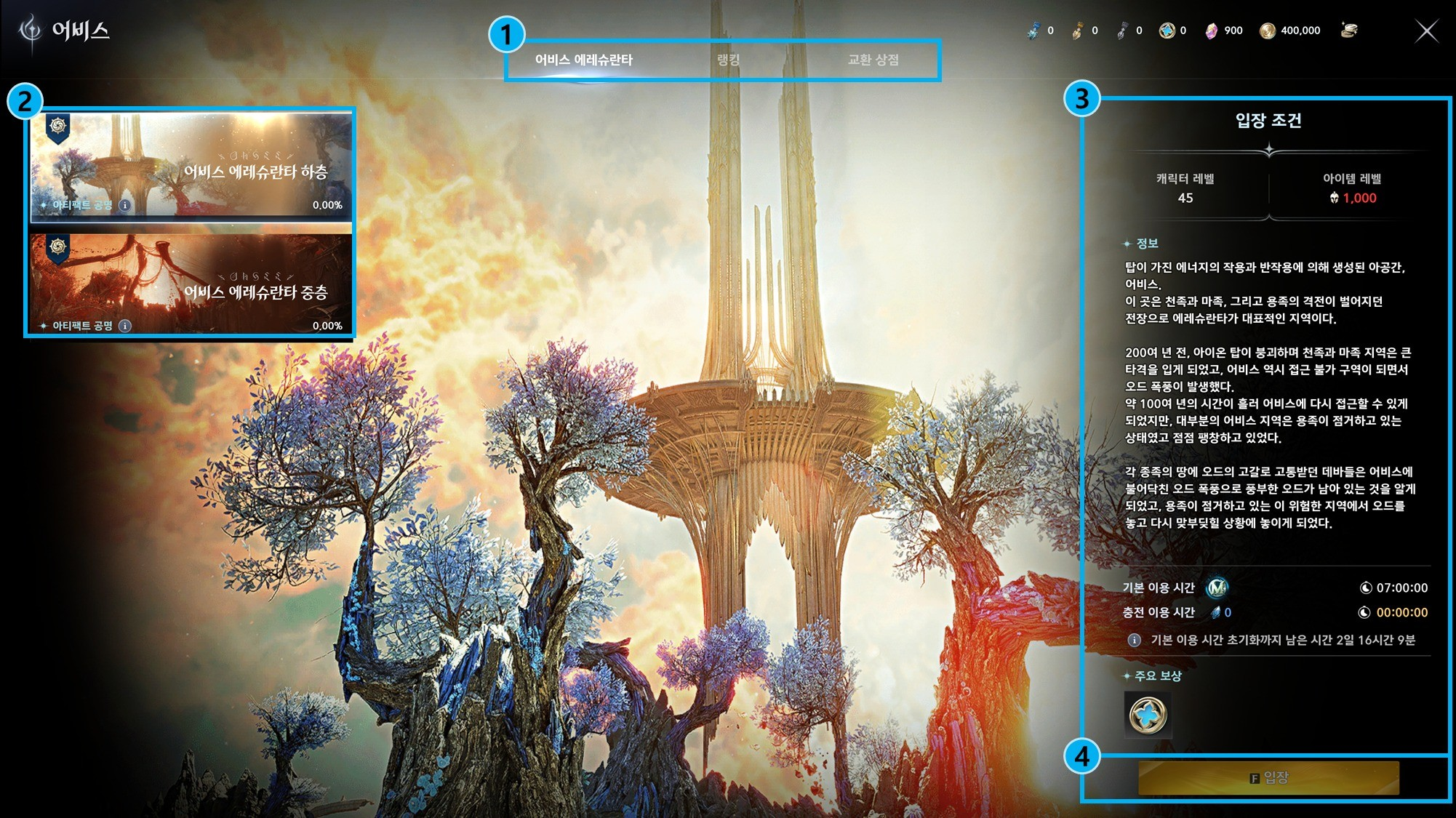 어비스 및 성역 어비스는 주간 7시간(멤버십 14시간) 이용이 가능합니다. 필드 PK의 위험이 있지만 보상이 확실합니다. 성역은 현재 엔드 콘텐츠인 8인 레이드로 매주 2회 도전 기회가 있지만, 아직은 스펙이 부족하다면 후순위로 미뤄두셔도 무방합니다.