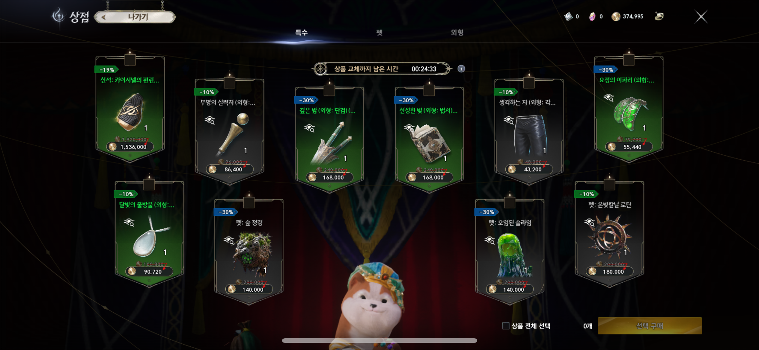 상점 체크 (검은 구름 무역단) 시간 단위로 갱신되는 상점입니다. 키나로 펫이나 장비 외형을 살 수 있는데, 특히 펫은 수급처가 매우 제한적이므로 키나 여유가 된다면 여기서 꼭 구매하여 도감을 채우고 이해도를 높여야 합니다.