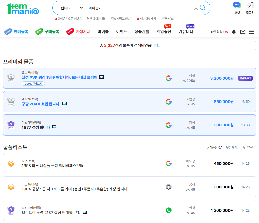 아이온2 계정거래 아이템거래 등 다양한 거래가 활발하게 이루어지고 있는데요 어떤 거래들이 이루어지고 있는지 궁금하시다면 아래 배너를 클릭해주시면 아이템매니아 공식 홈페이지로 바로보실수 있습니다!