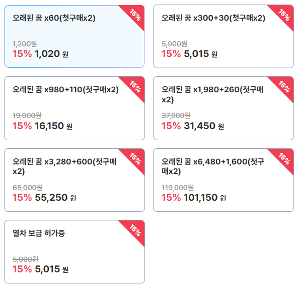 게임마다 구성은 다르지만 보통 아래와 같은 상품들을 충전할 수 있습니다.