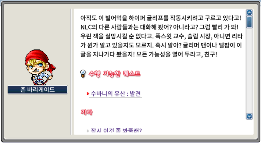 | 수바니의 유산 2 | 일렉트로펀트 처치 후 퀘템 50개 | 메이플 에이드 5개 |