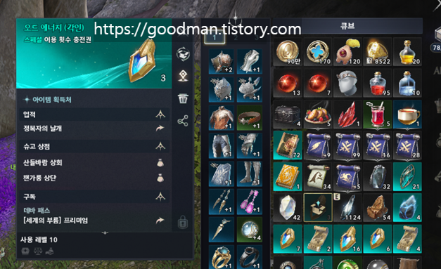 오드 에너지 소모: 부캐릭터로 매일 접속하여 오드 에너지를 소진하고 오드 큐브 보상을 받습니다. 여기서 나오는 키나 수십만 개가 주 수입원입니다.