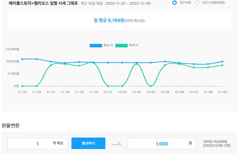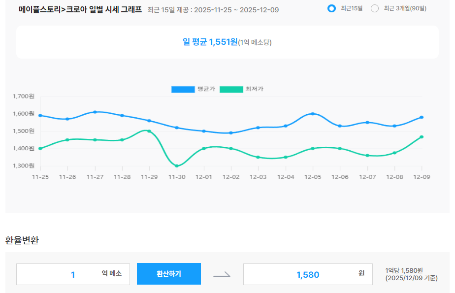 1억 메소당 시세: 819원 ~ 1,740원 사이로 변동 폭이 큽니다.