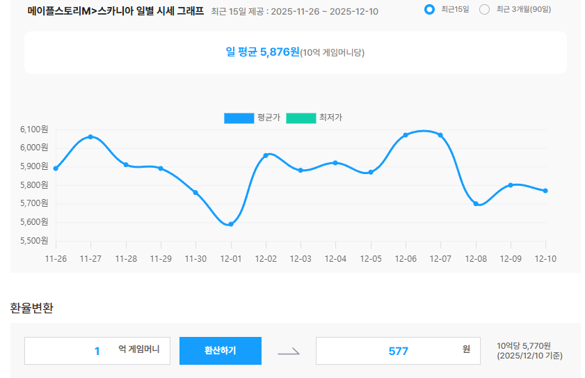 그래서 메소 거래 전에는 반드시 아이템매니아의 최근 7~15일 시세 그래프를 확인해야 합니다.